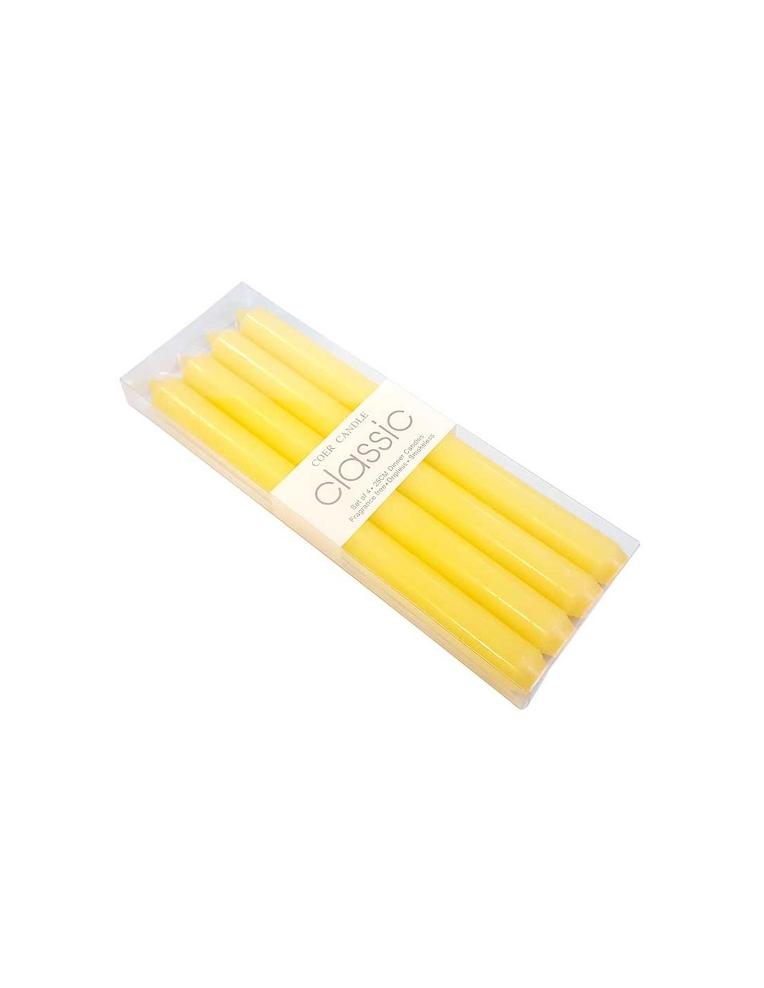 Karton mit 48 Sets zu je 4 durchgefärbten strohgelben Tischkerzen. 25 cm, sie verströmen weder Duft noch Rauch und tropfen nicht. Brenndauer 8 Stunden.