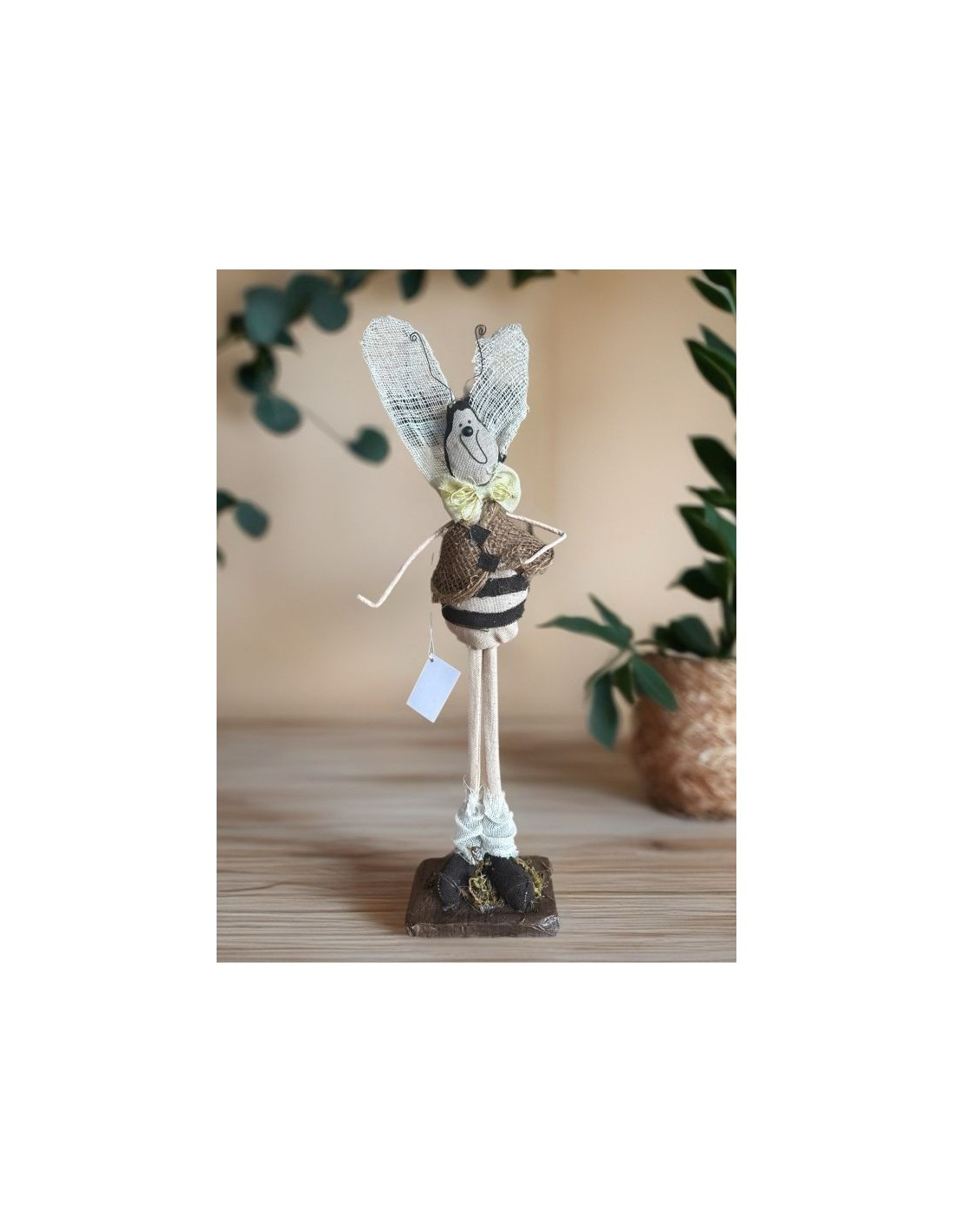 Charmante dekorative Biene im Landhausstil, gefertigt aus Stoff und Jute, montiert auf einem Holzsockel.