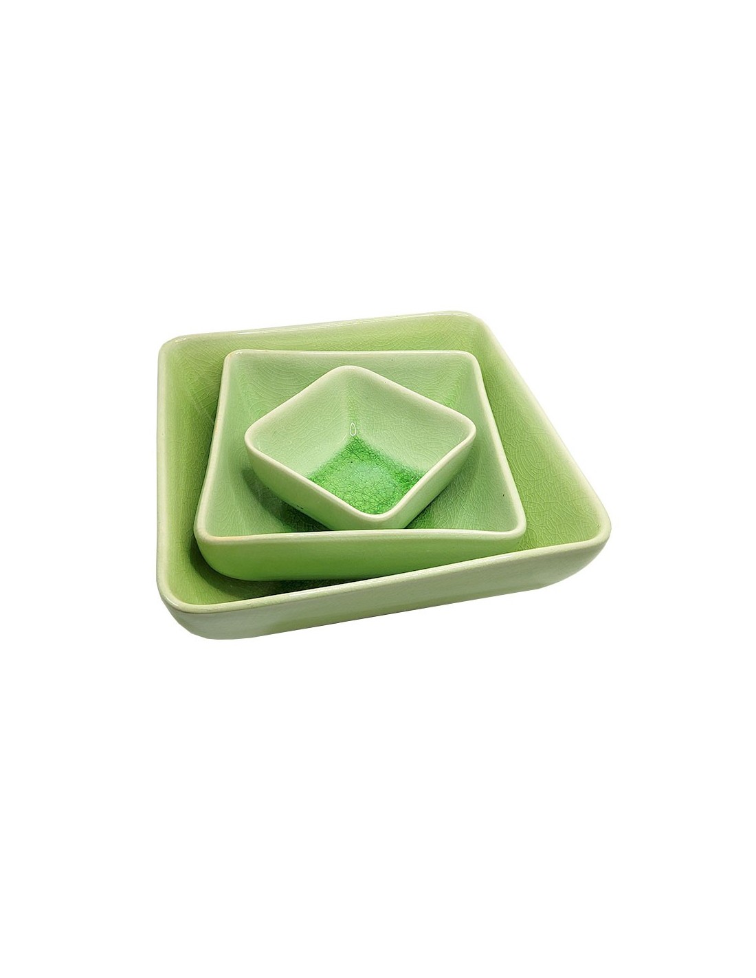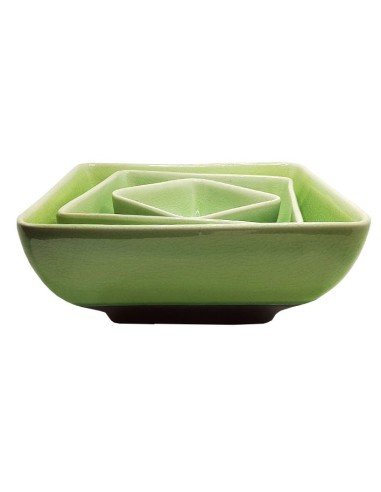 Juego de 3 platos cuadrados en cerámica esmaltada verde con fondo marrón. Artesanía cuidadosa. Apilable para un almacenamiento cómodo. Ideal para cocina asiática o presentación cuidada.