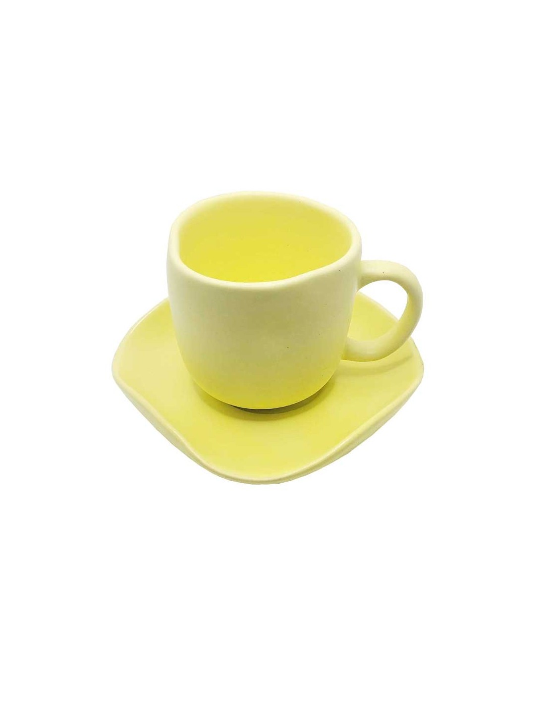Taza amarilla con platillo de cerámica, elegante y atemporal. Perfecta para disfrutar de un café, un té o una infusión en una taza con platillo de estilo sobrio y moderno. Su acabado suave y su color neutro se integran fácilmente en cualquier cocina. Un conjunto práctico y estético para acompañar tus pausas diarias para el café o el té.