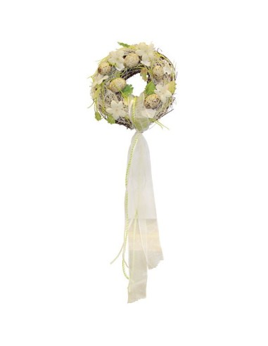 Esta encantadora corona de Pascua, realizada totalmente a mano, aportará un toque fresco y auténtico a su hogar. Con sus huevos decorativos, sus delicadas flores blancas y sus detalles naturales, encarna el espíritu de la primavera. Perfecta para decorar sus paredes o mesas, su ligereza y pequeño diámetro la hacen ideal para cualquier superficie.