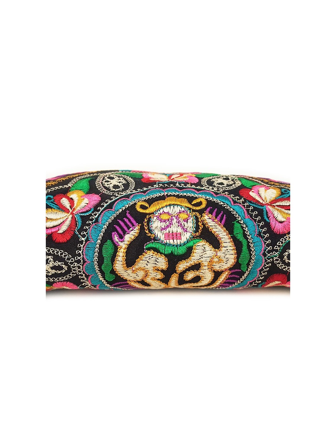 Pochette en tissu noire, brodée de motifs de visage de la chance, de floraux et végétaux sur toute sa surface. Avec ses fils colorés chatoyants, cette trousse est un atout chic et bohème pour une sortie ou un voyage en tant que trousse de bain. L'intérieur est divisé en deux compartiments pour une meilleure organisation. La fermeture éclaire est décorée d'un pompon rouge et d'une tirette longue et dorée. La lanière permet de la transporter aisément.