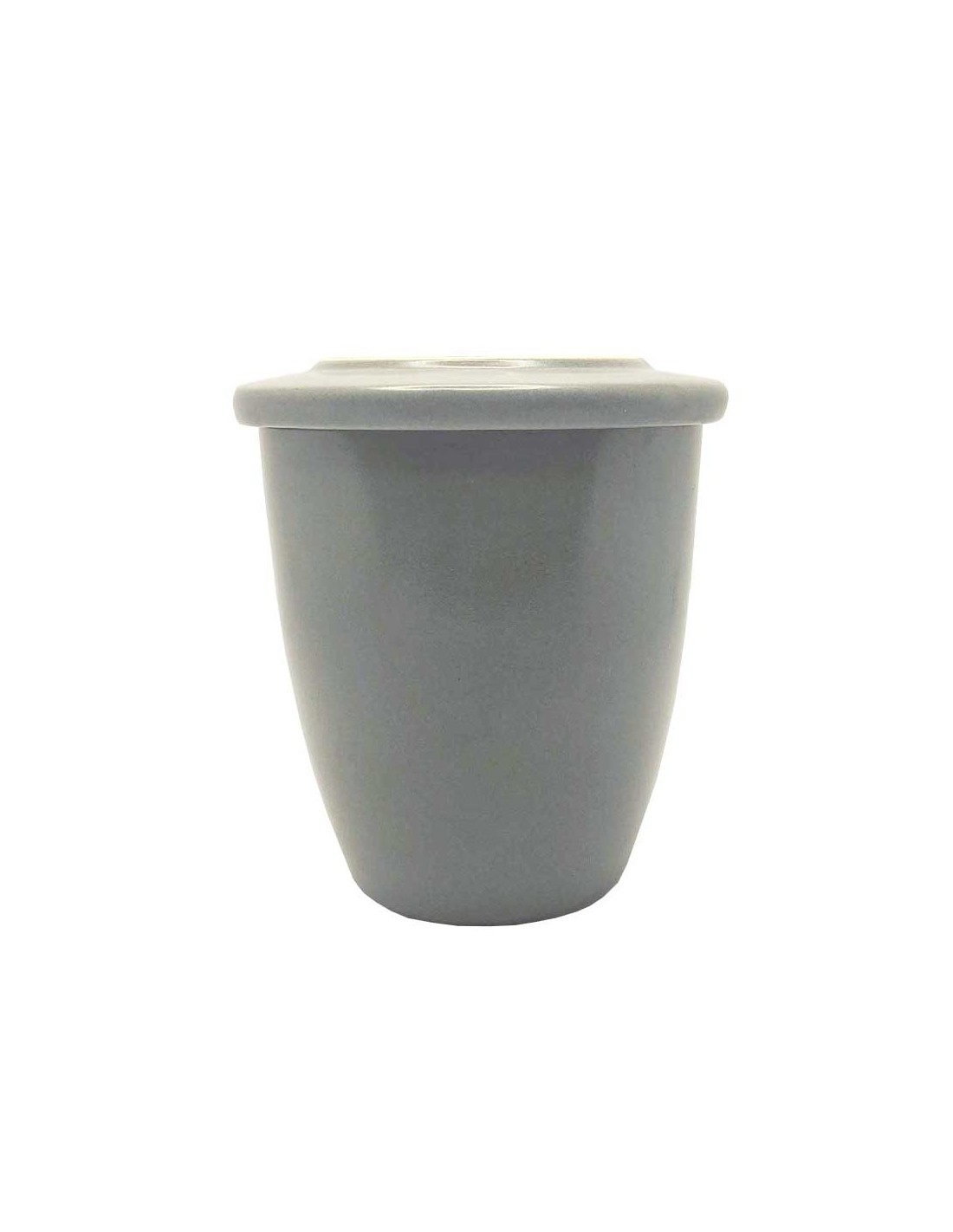 Tasse avec couvercle, sans anse, en céramique gris souris mat, réalisation artisanale. Ce grand mug à thé ou à café est parfait pour les moments de détente. Son couvercle assorti permet de garder le liquide au chaud pendant l'infusion du thé, puis de poser le sachet une fois infusé.