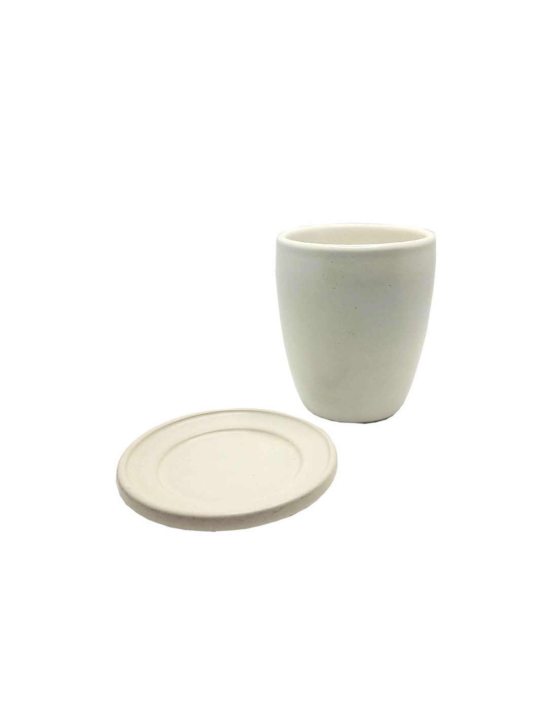 Mok met deksel, zonder oor, van mat wit keramiek, handgemaakt. Deze grote thee- of koffiemok is perfect voor ontspannen momenten. Het bijpassende deksel houdt de vloeistof warm terwijl de thee trekt en biedt vervolgens plaats aan het theezakje.