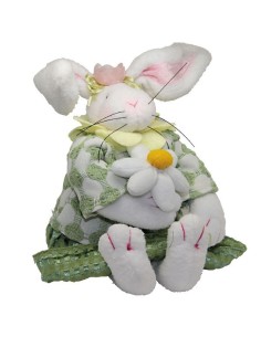 Dit konijn met strogele sjaal en strik heeft knopen en een geruit schort met bloemen. Uit de schort komt een ander konijntje tevoorschijn, als een kind dat gedragen wordt door zijn moeder.